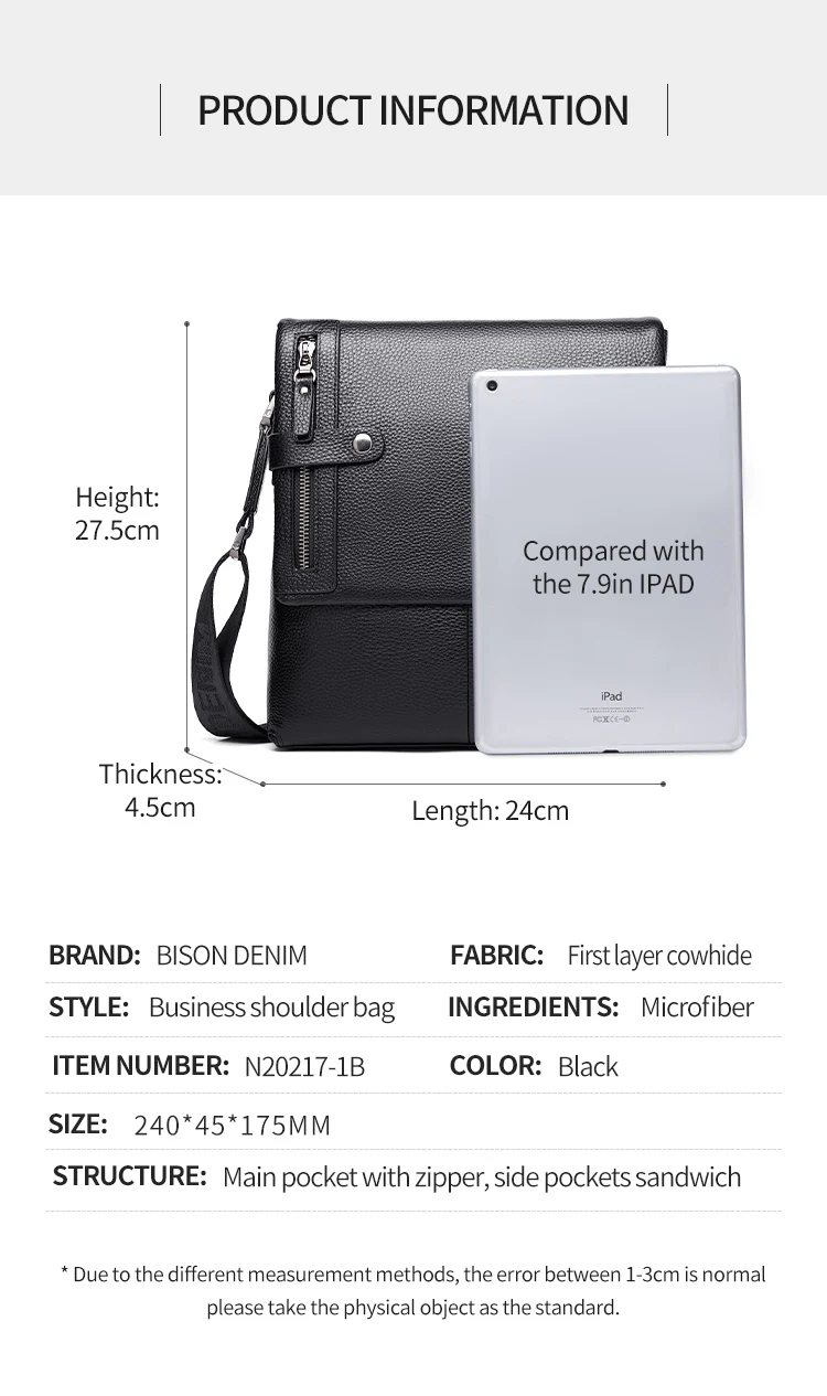 BISON DENIM New Genuine Leather Men Handbags Flap Men’s Shoulder Bag Casual Office Messenger Bags Fashion Crossbody Bag